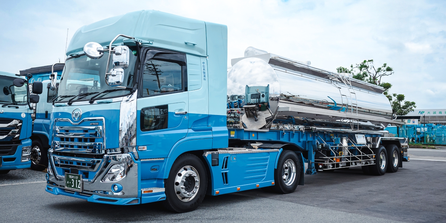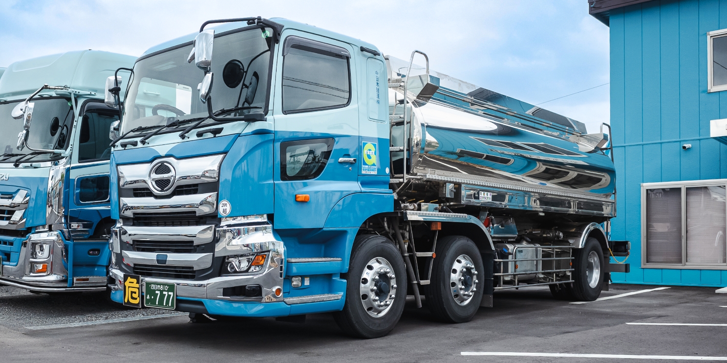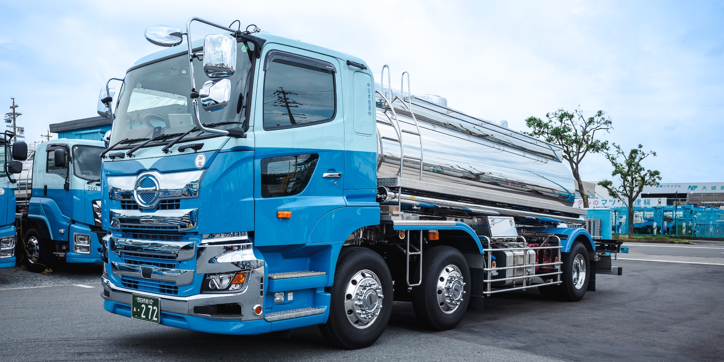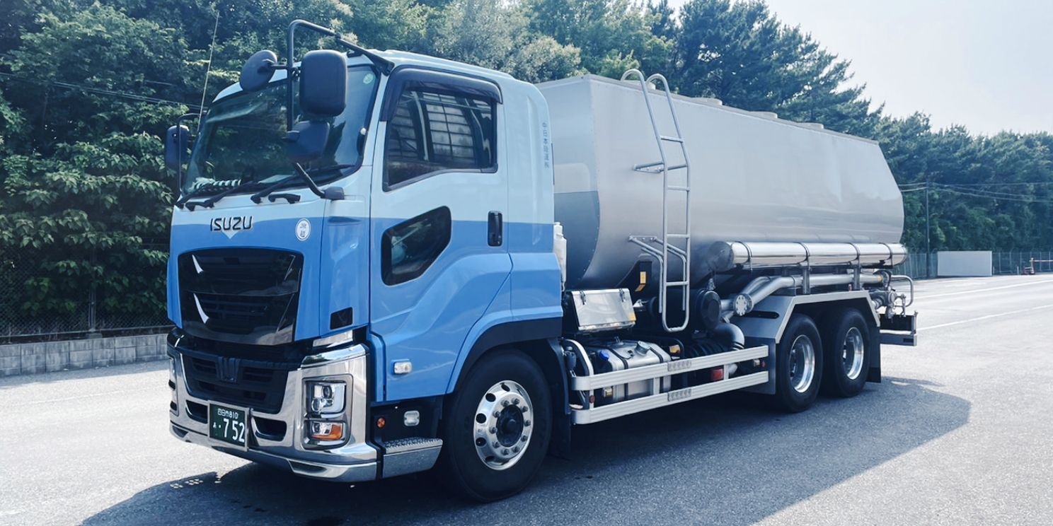10トンのタンクローリー車。液糖を運搬するために使用される車両で、全長が約10メートル程度、最大積載量は約11,000キログラムで、最大容量は約9,000リットルです。液糖とは液体状の糖類の総称のことで、食品製造業界などで幅広く利用されています。